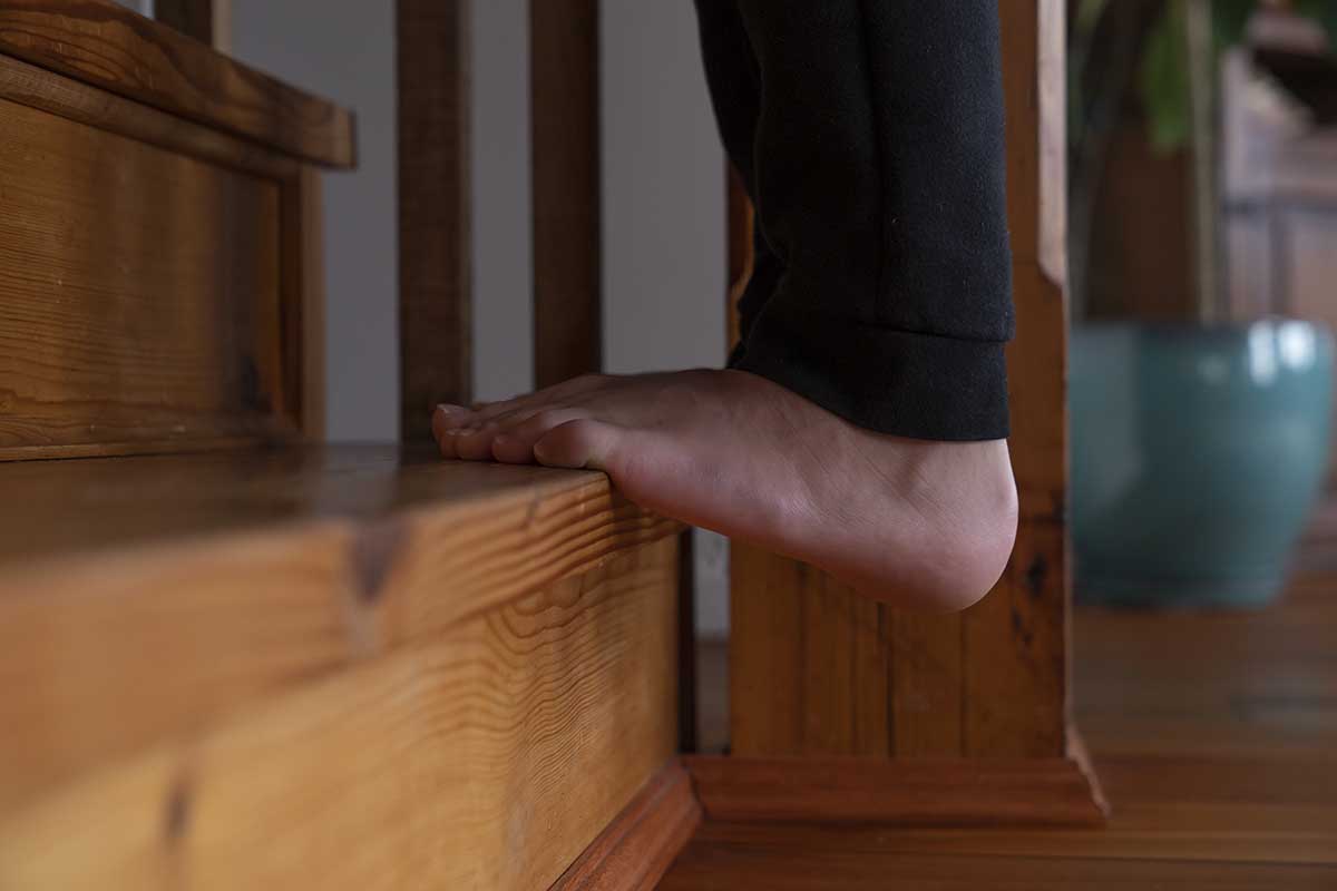 - Standing on a stair step, hold onto the railing as you slowly drop your heels over the edge of the step and relax your calf muscles.