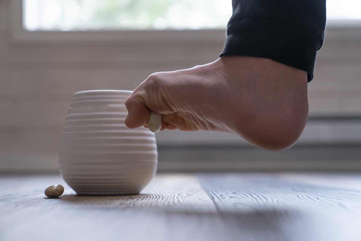 - Move each marble from the floor to the cup by grasping them one at a time with your toes.