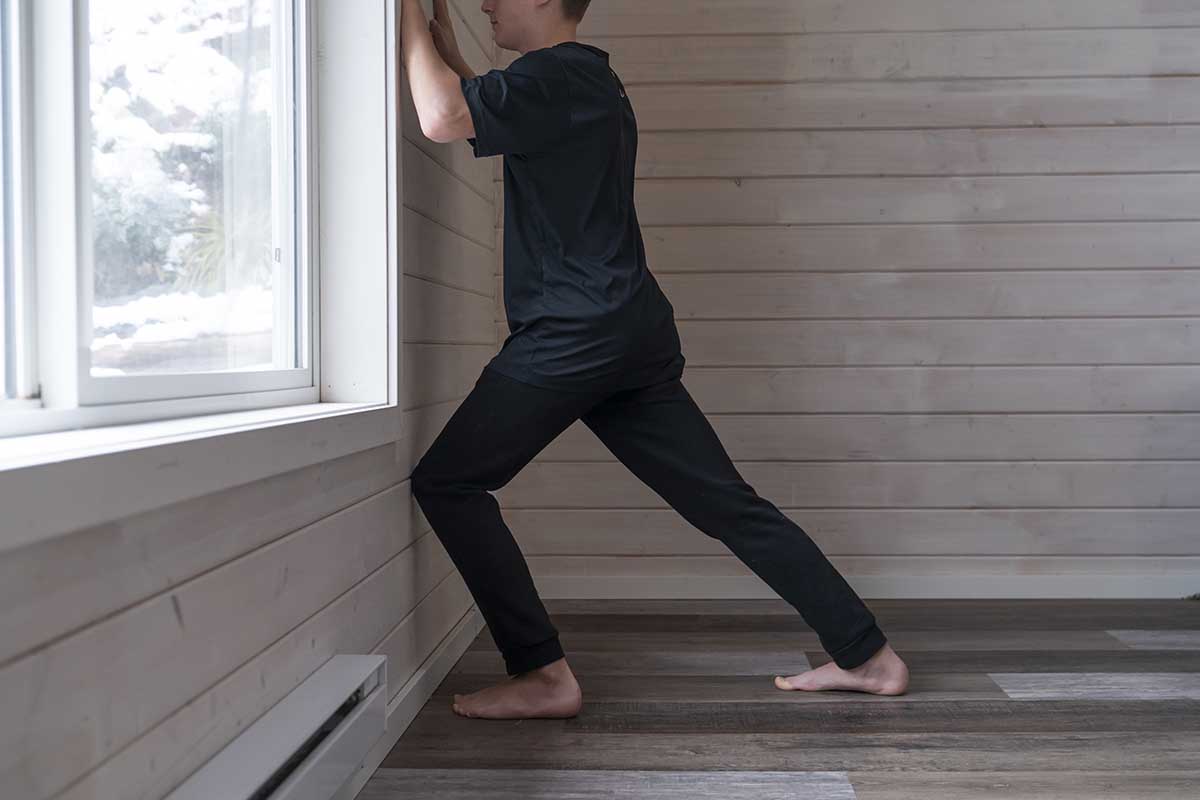 - Keep the heel of your back leg on the floor, bend your front knee until you feel a stretch in the back leg.
