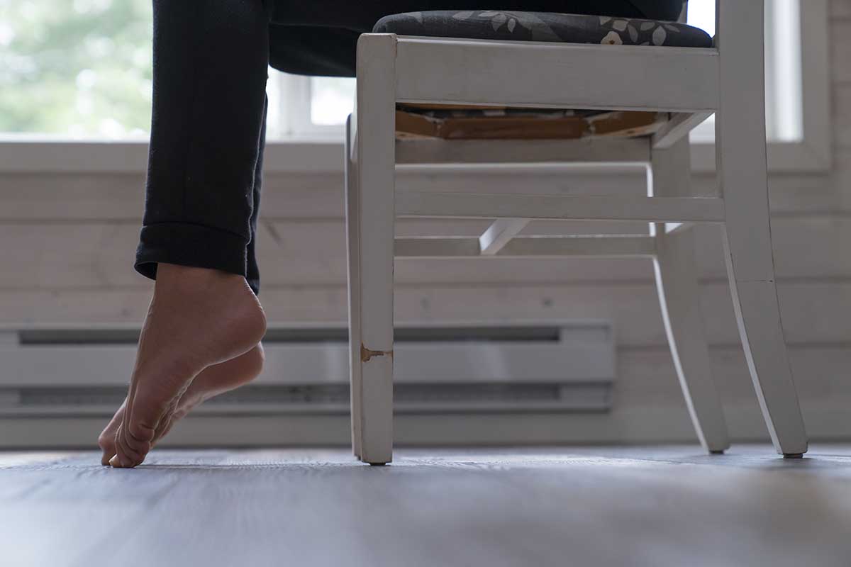 - Sitting on a chair and keeping the tips of your toes in contact with the floor, raise your toes up as high as you can without pain.
