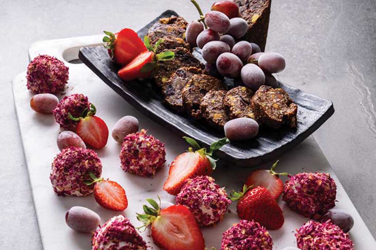 Dessert “Charcuterie” with Chocolate Pistachio Salami and Rose Petal Labneh