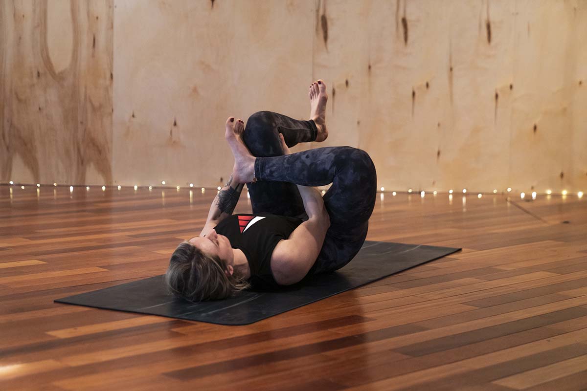 - Reach behind your bent knee to grasp your thigh with both hands. Allow your head to remain relaxed on the floor. Grab your knee with one hand and your ankle with the other