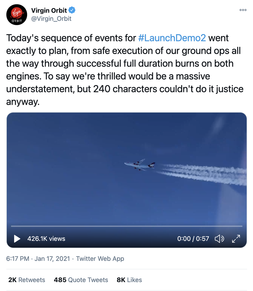“Today’s sequence of events for LaunchDemo2 went exactly as planned, from the safe execution of our ground operations to the successful full-duration burns on both engines. To say we’re excited would be an understatement, but 240 characters couldn’t do it justice anyway, ” Virgin Orbit said.