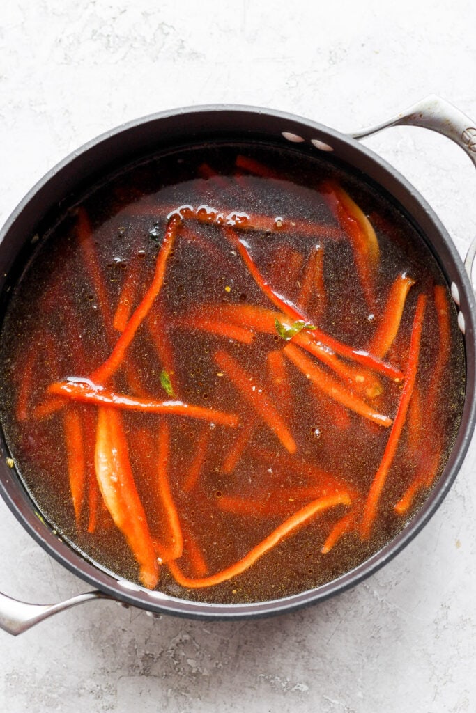 - Then, add the black tea mixture to the dutch oven with red pepper and carrots. Stir to combine.
