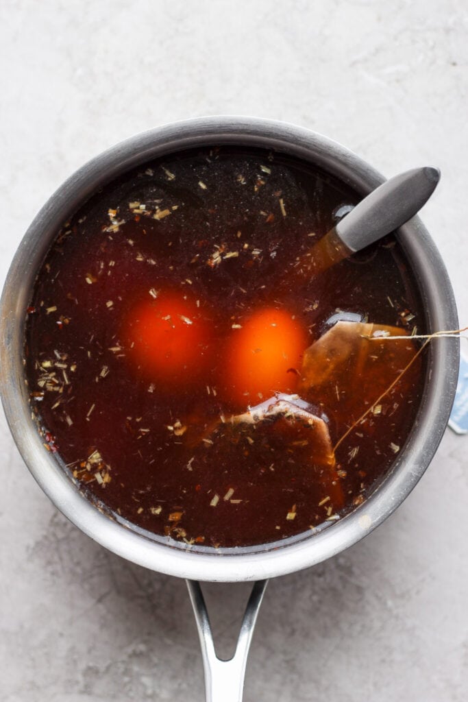 - Carefully remove the ramen eggs from the liquid and set them aside for later and discard the tea bags. The remaining liquid is going to help flavor the broth of the ramen.