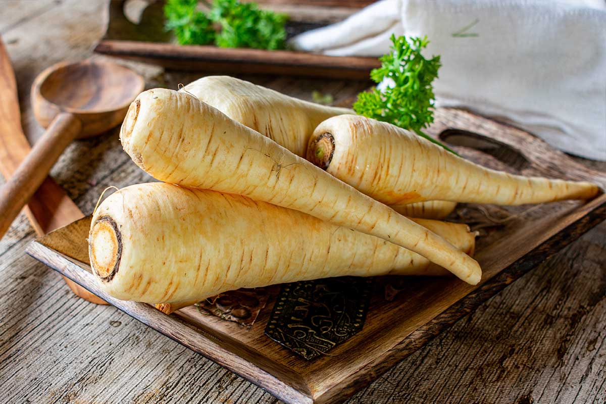 Parsnips are in season from late fall to early spring and develop a sweeter flavor after winter frosts. Fun fact: parsnips were used as a sweetener before the cultivation of sugar beets and cane sugar. Want to sweeten up to parsnips? Make them exciting by whipping up Potato Parsnip Pear Soup with Smoked Gouda or kid-friendly Chicken Nuggets, which use two mashed parsnips.