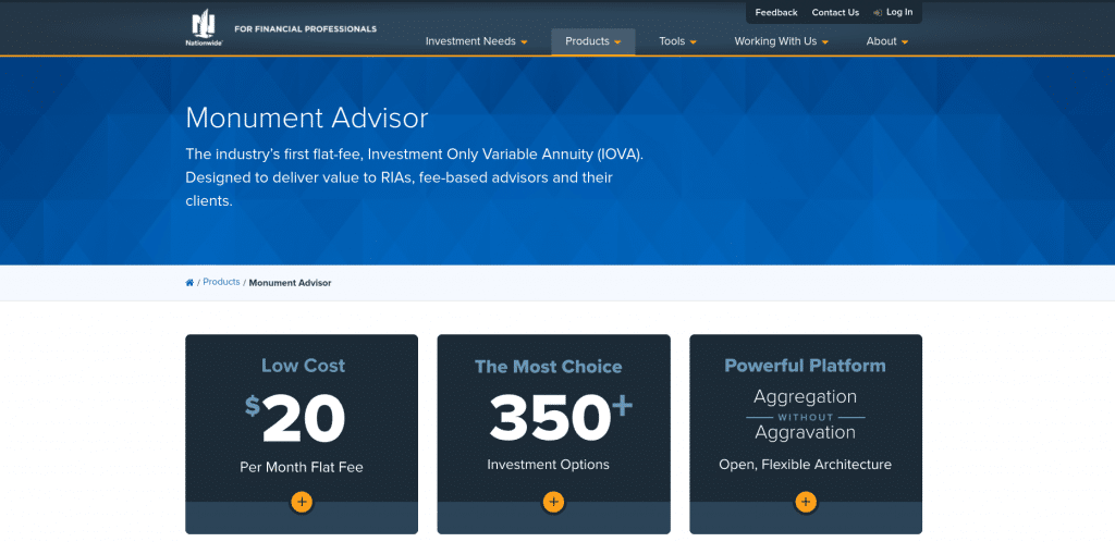 Nationwide Monument Advisor Registered Index Both The industry’s first flat fee, Investment Only Variable Annuity (IOV) $15,000.00     Free – up to 10% of contract value $20 A+