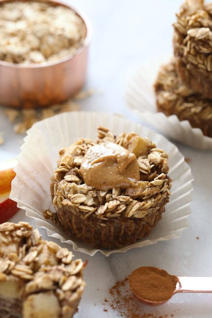 Baked oatmeal cups is exactly what it sounds like. It’s baked oatmeal in little muffin cup form. This can be great for portion control. It’s also a great on-the-go snack! My fav? Baked Apple Oatmeal Cups. They’re so moist and delish!