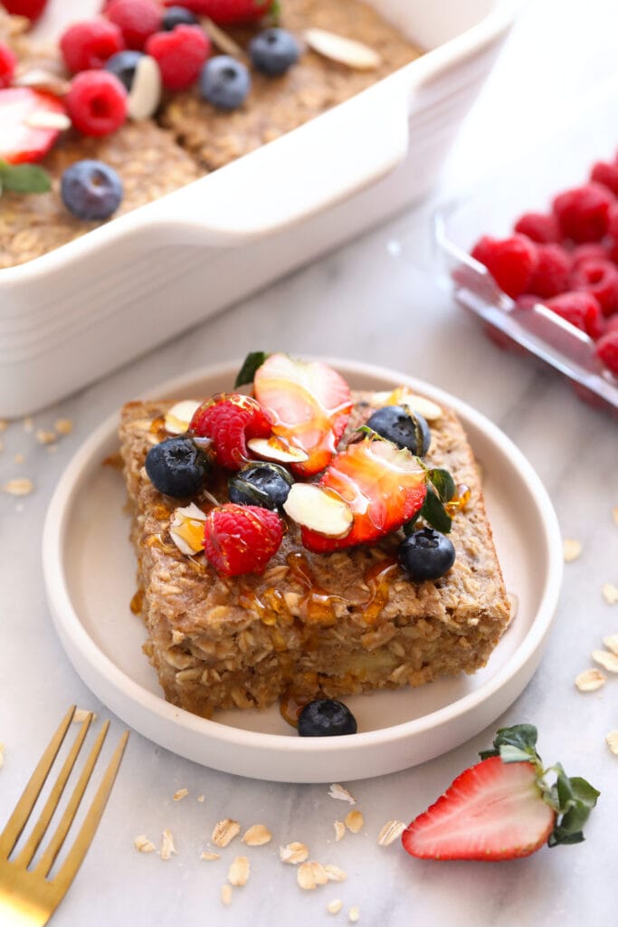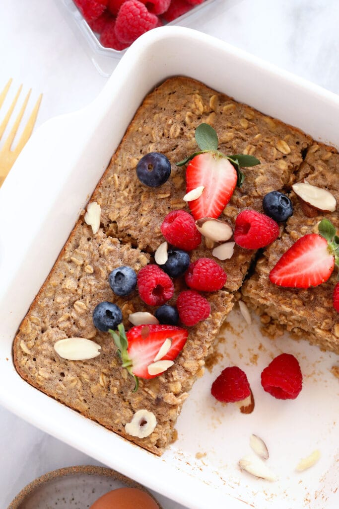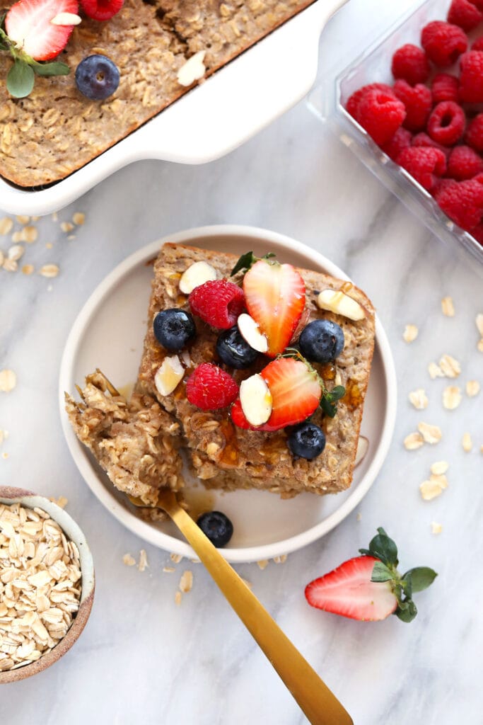 Sweetener: our favorite sweeteners to use in baked oatmeal are maple syrup and honey. We like to keep things refined-sugar free, which is why we don’t use white sugar or brown sugar in our oatmeal bake recipes.