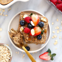 Here are our top baked oatmeal recipes from Fit Foodie Finds. My personal favorite? Peanut Butter Banana Baked Oatmeal. It’s yours too! It has almost 30 5-star reviews.
