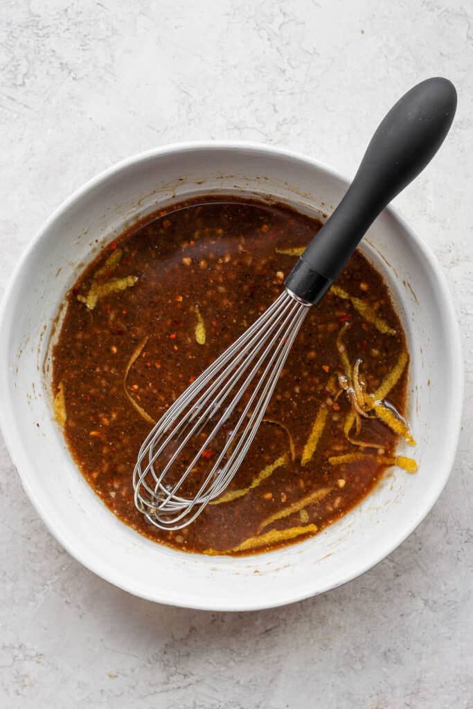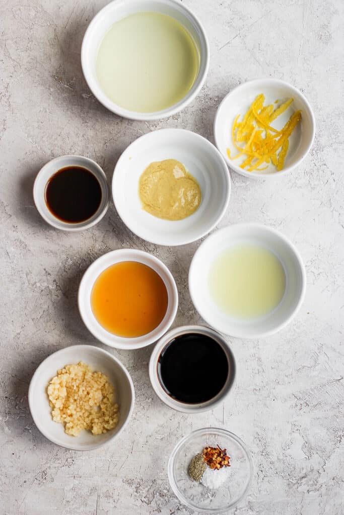 - Place balsamic vinegar, olive oil, Worcestershire, honey, dijon, lemon juice, lemon zest, garlic, red pepper flakes, salt, and pepper into a medium bowl.