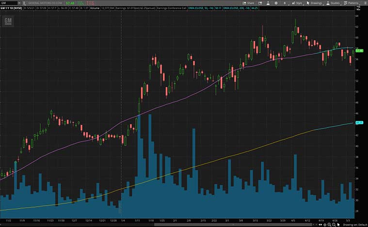 General Motors is a multinational corporation that is headquartered in Detroit, Michigan. It is one of the largest automobile manufacturers in the world and the largest in the U.S. Its four core automobile brands are Chevrolet, Buick, GMC, and Cadillac have very strong brand loyalty. GM stock currently trades at $57.38 as of 11:24 a.m. ET and has been up by over 40% year-to-date. The company has just reported strong first-quarter financials today.