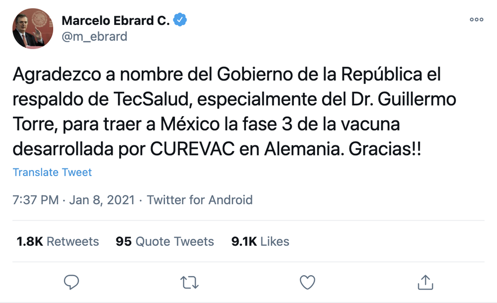 Through his Twitter account, the Foreign Secretary announced that the federal agency of the Government of Mexico endorsed the final testing stage, phase 3 for the antidote to CureVac.