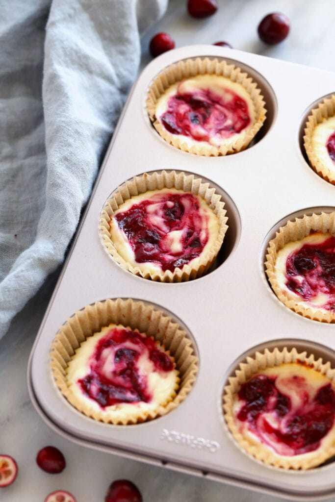 - Then, spoon on around 1 heaping teaspoon cranberry sauce into each mini cheesecake. Use a toothpick or knife to swirl the cheesecake mixture with the cranberry sauce.