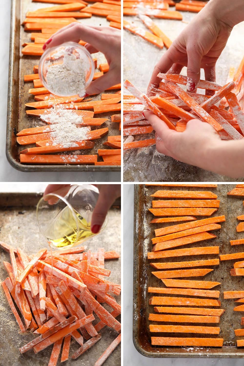 Corn starch is the brains of this operation! Make sure that you toss the sweet potato fries in the corn starch mixture BEFORE you drizzle oil on top.