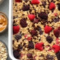 One of our all-time favorite healthy breakfast recipes is this Dark Chocolate Berry Baked Oatmeal. It’s sweetened naturally with banana and maple syrup and truly tastes like dessert for breakfast!