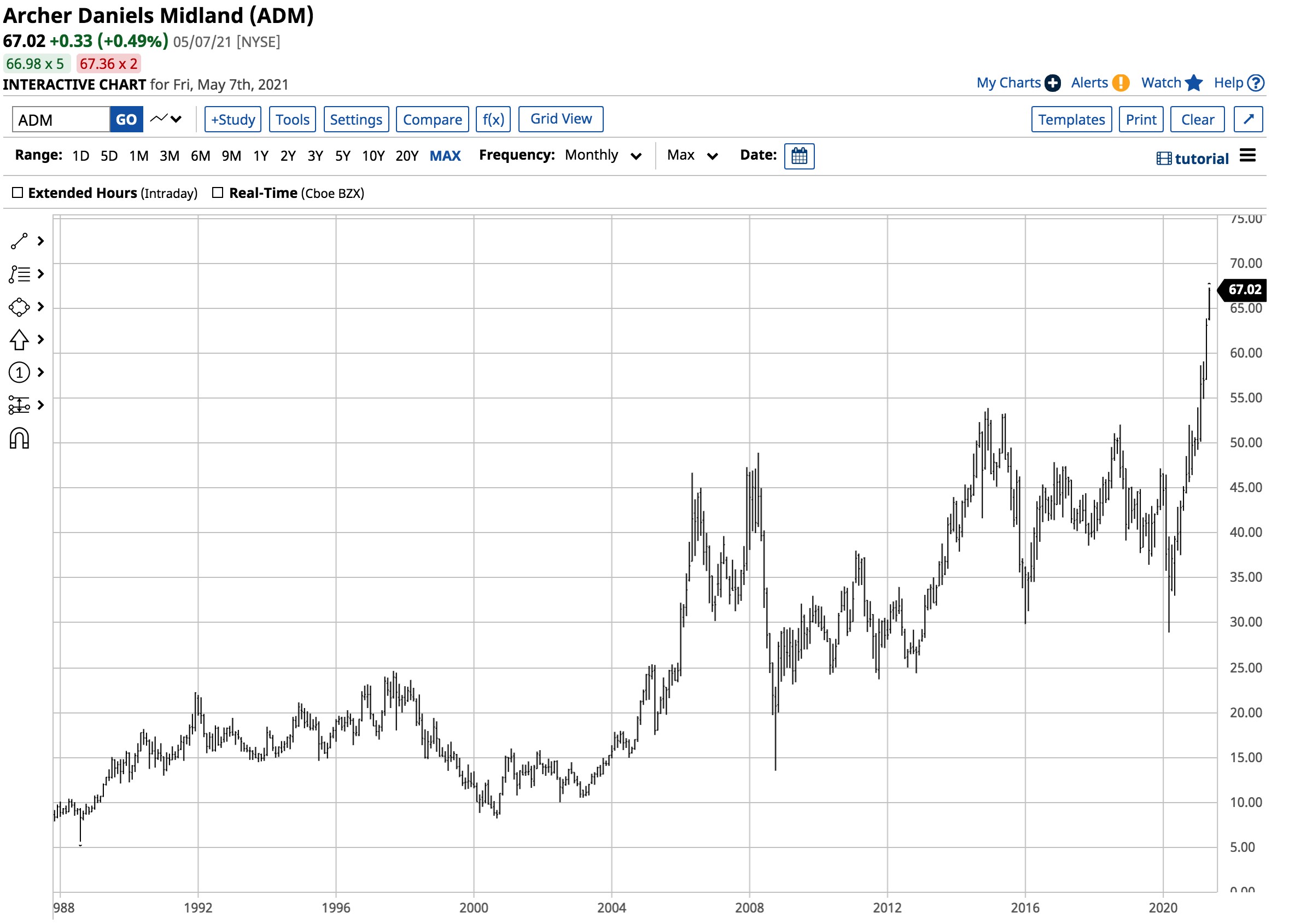 The long-term chart highlights the bullish trading pattern in ADM shares that took them to their latest all-time high last week at $67.34 per share. ADM far more than doubled since the pandemic-inspired $28.92 low in March 2020.