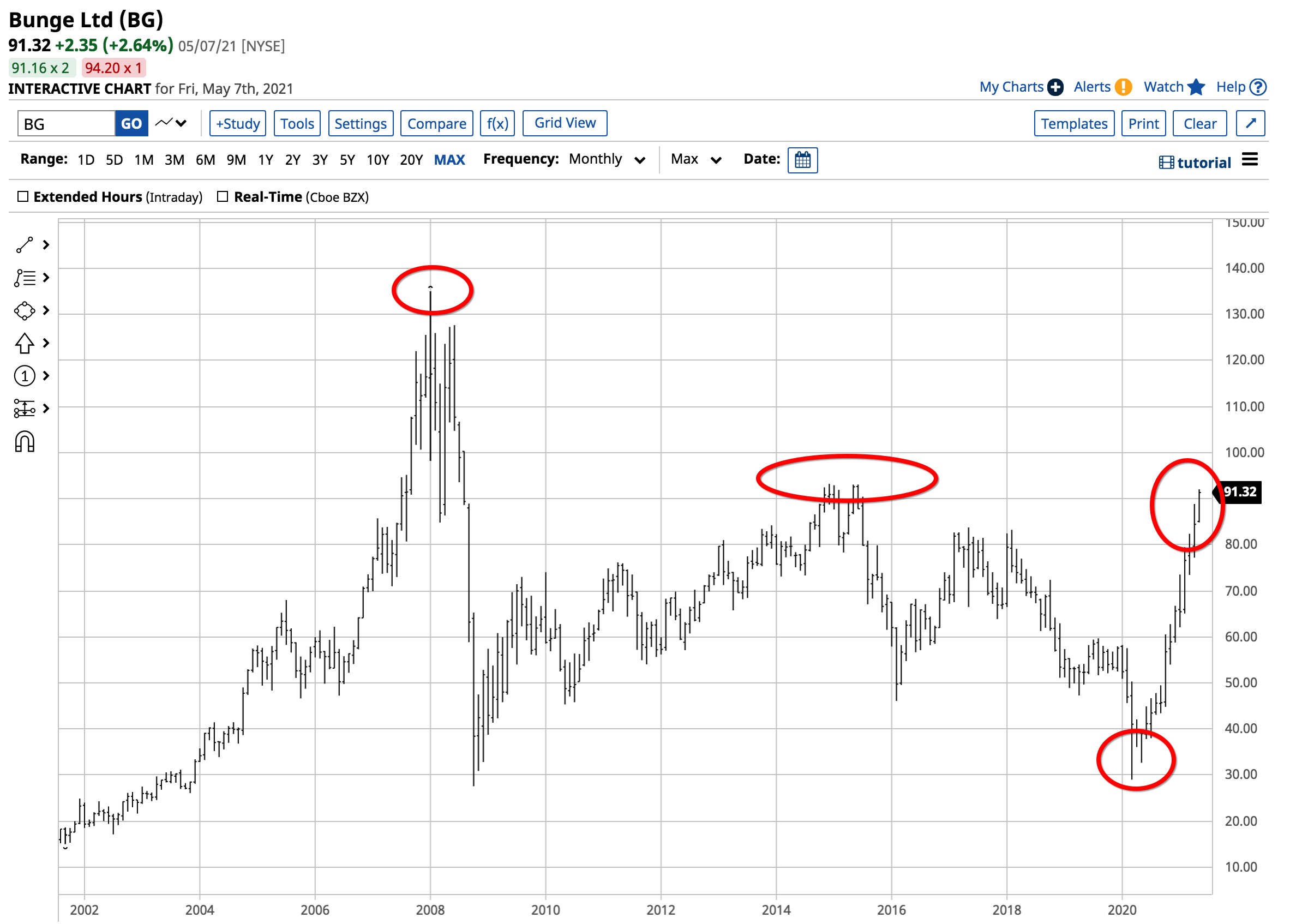 The chart illustrates the rise in BG’s shares from the March 2020 $29 low to the most recent $91.99 high ion May 7. The nearby upside target stands at the December 2014 $93.17 high, with the all-time high from 2008 sitting at $135 per share. The weak Brazilian currency has likely weighed on BG shares over the past years. The real hit a high of $0.65 against the US dollar in 2008 when BG shares peaked. The currency relationship was just above the $0.1900 level at the end of last week.