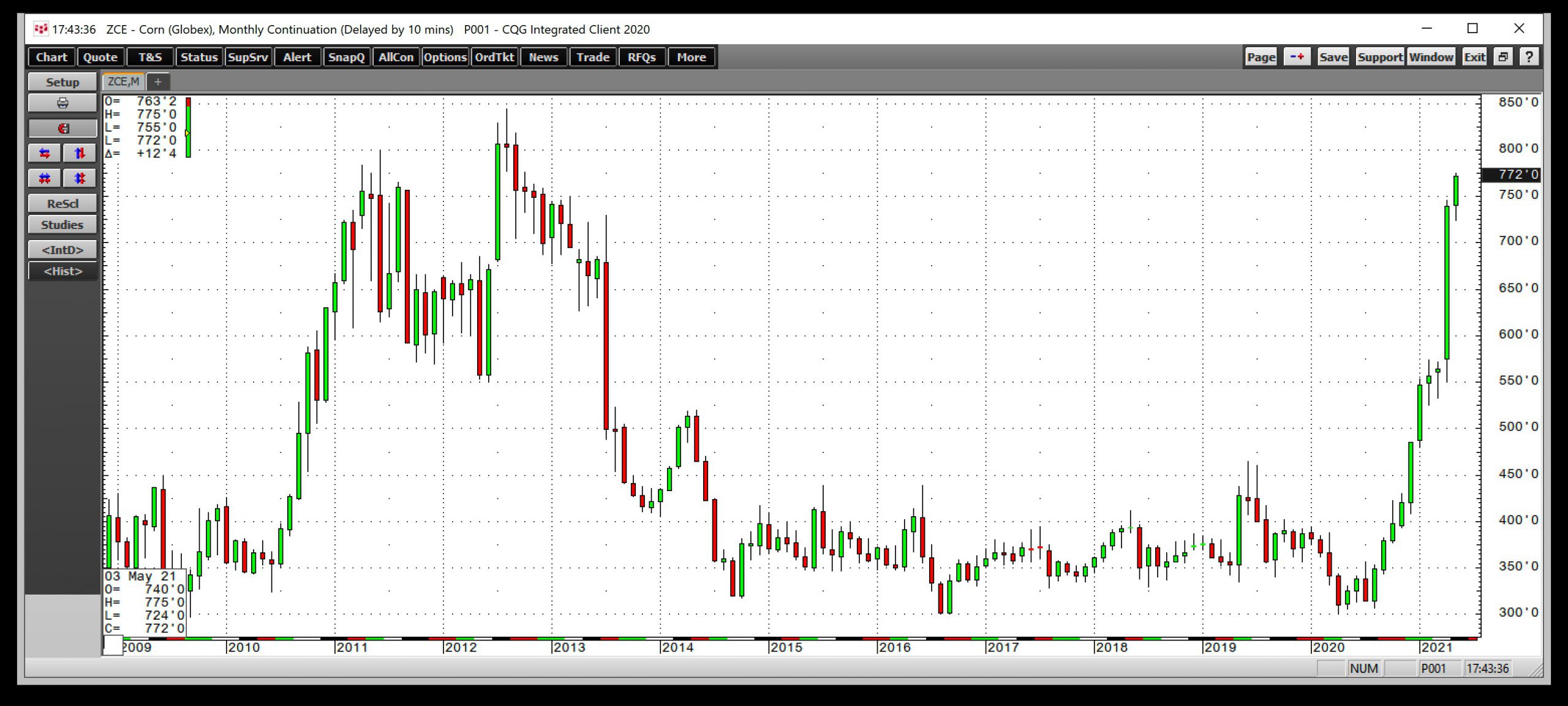 As the monthly chart highlights, corn futures rose to their latest high at $7.75 per bushel on May 7, the highest level since October 2012. In 2012, corn reached its record peak at $8.4375 per bushel. Corn exploded higher from the $3 per bushel level in April 2020. The input cost for US ethanol production has been rising with the price of corn.