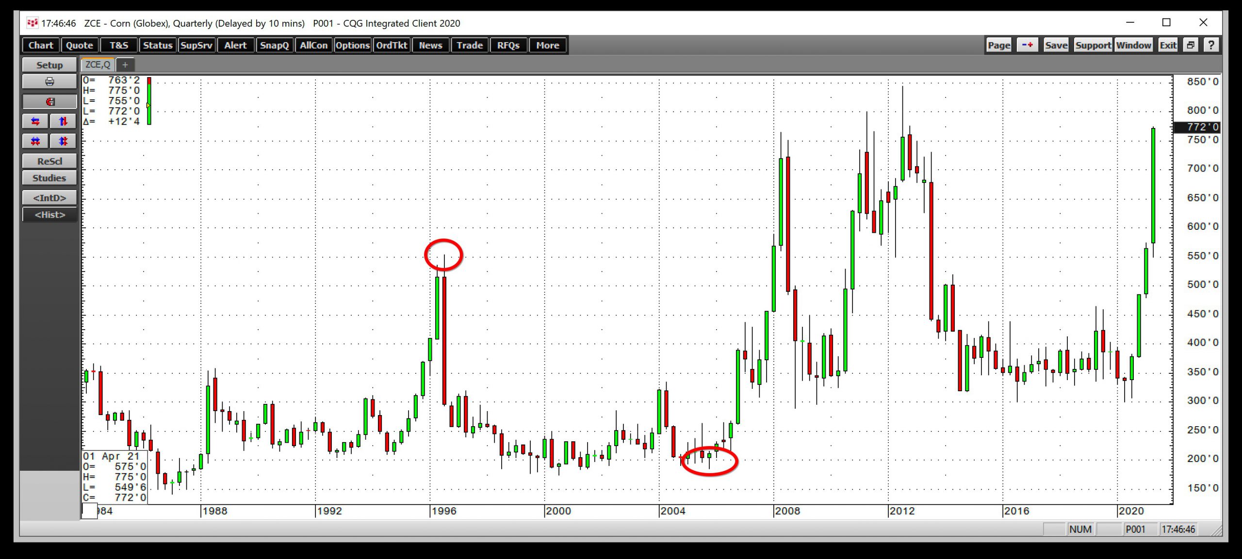 The quarterly chart shows that in 2005, corn prices reached a low of $1.8575 per bushel. The all-time high at that point was at $5.5450, the 1996 peak. The ethanol mandate established a higher range for corn prices, benefiting the US agricultural sector.