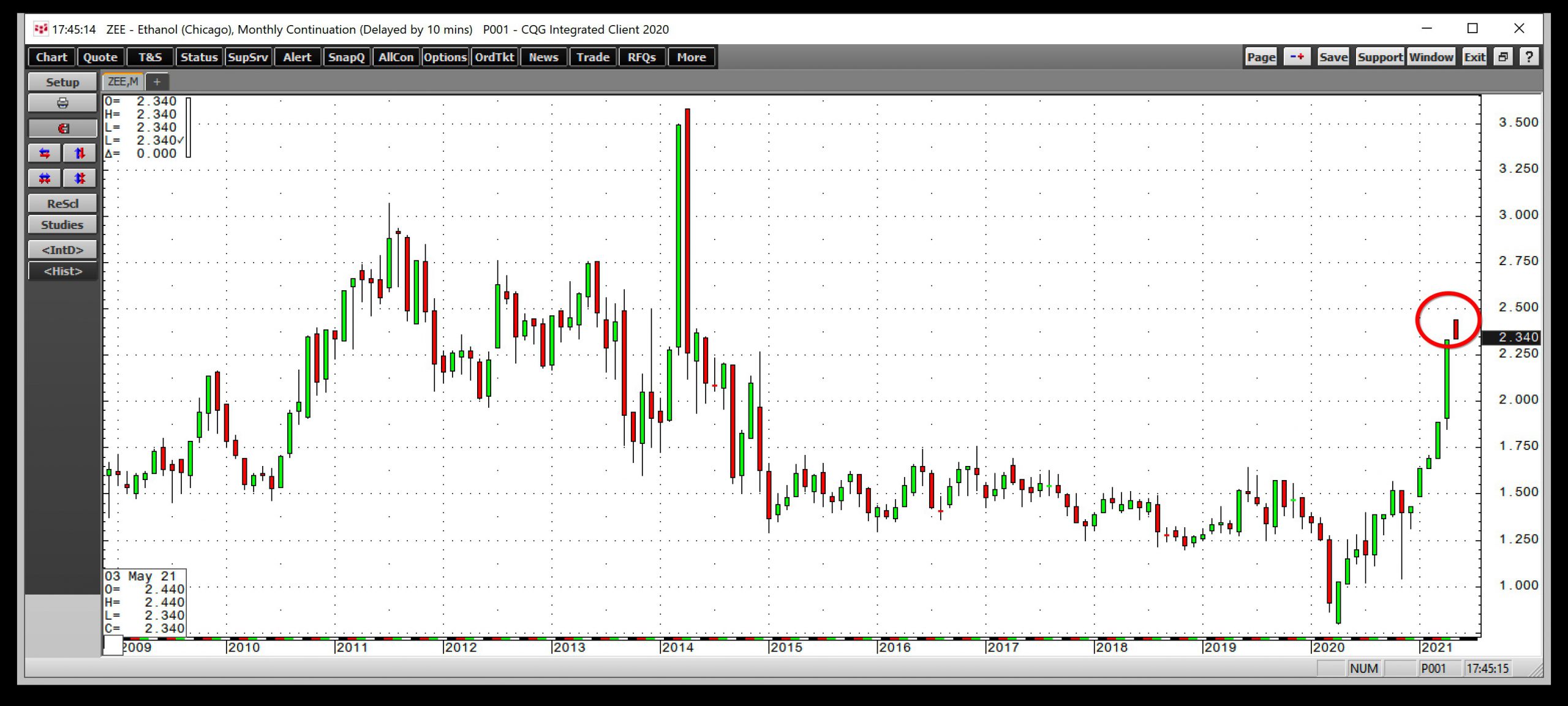 The monthly chart shows that ethanol futures reached a new multi-year high last week at $2.44 per gallon wholesale. The last time ethanol futures reached the current level was back in April 2014. At that time, other energy and fuel prices were far higher.