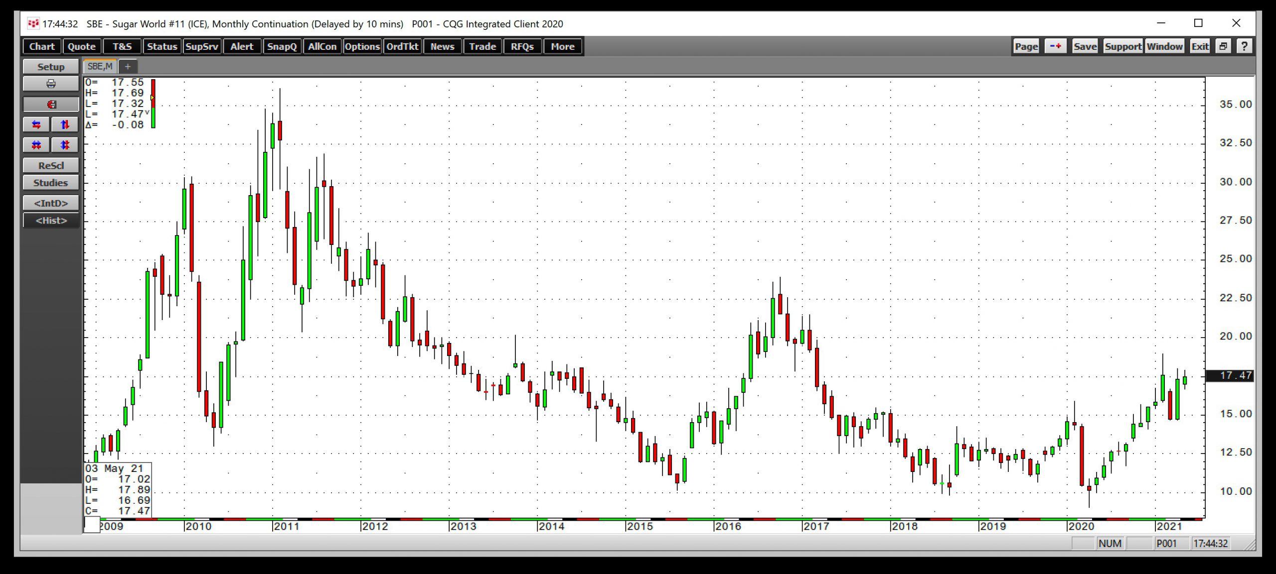 The monthly chart of ICE sugar futures shows the move from a low of 9.05 cents per pound in April 2020 to the most recent high of 18.94 cents in February 2021. At the February peak, sugar reached its highest price level since March 2017. Sugar was trading at nearly the 17.50 cents level at the end of last week. The input cost for Brazilian ethanol has increased because of the rise of sugar’s price.
