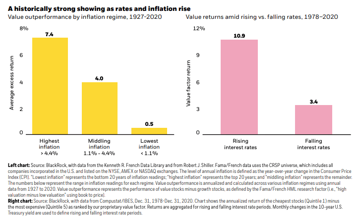 Stocks actually fare pretty well during times of inflation. According to a report from BlackRock, “We believe stocks are one of the best places to be in a rising inflation world. Our review of data back to the 1920s finds that equities perform well as long as inflation isn’t out of control ― over 10%, which is historically rare and not our expectation even in this unusual cycle. In above average inflation environments (5%-10%), value stocks have performed particularly well.”