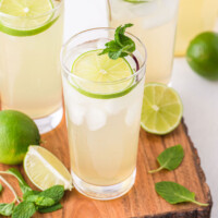 This limeade is a great recipe to double or triple to serve a crowd! Simply use the multiplier in the recipe card, and use the same instructions. Serve in a large beverage dispenser with mason jar glasses for the perfect backyard BBQ beverage.