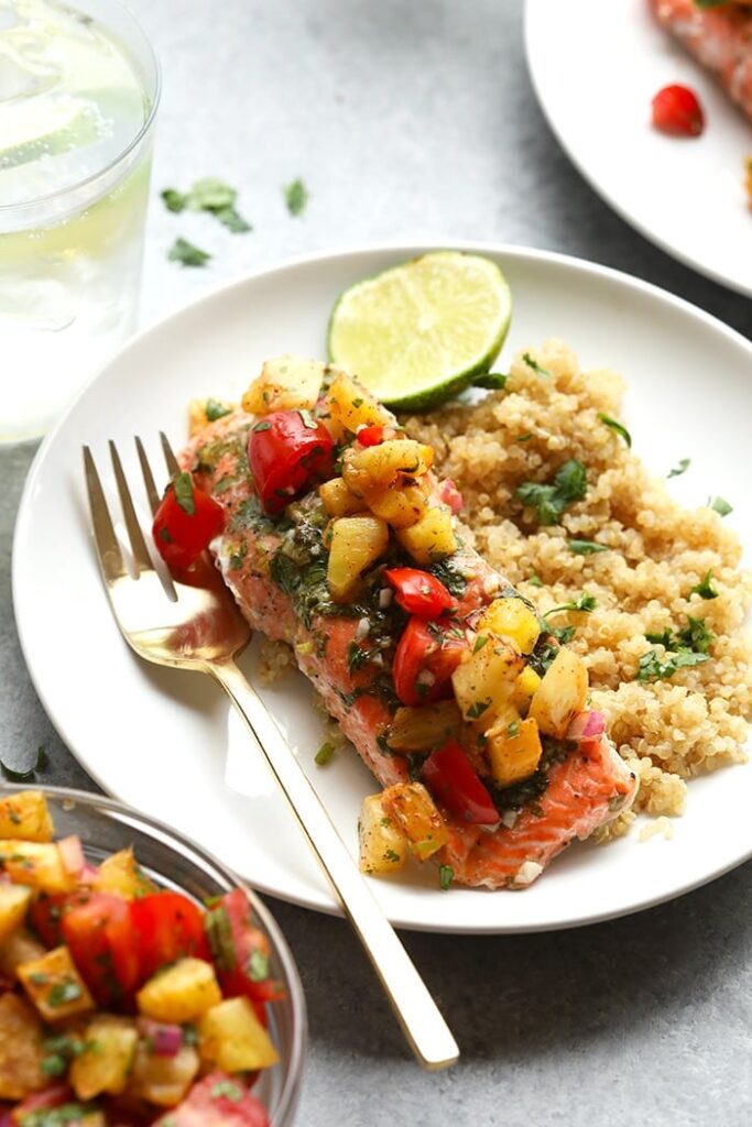 Serve salmon with grilled pineapple salsa and grain of choice (we chose quinoa!).