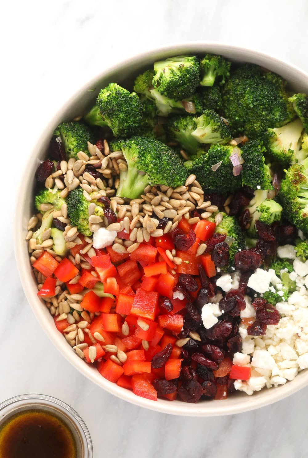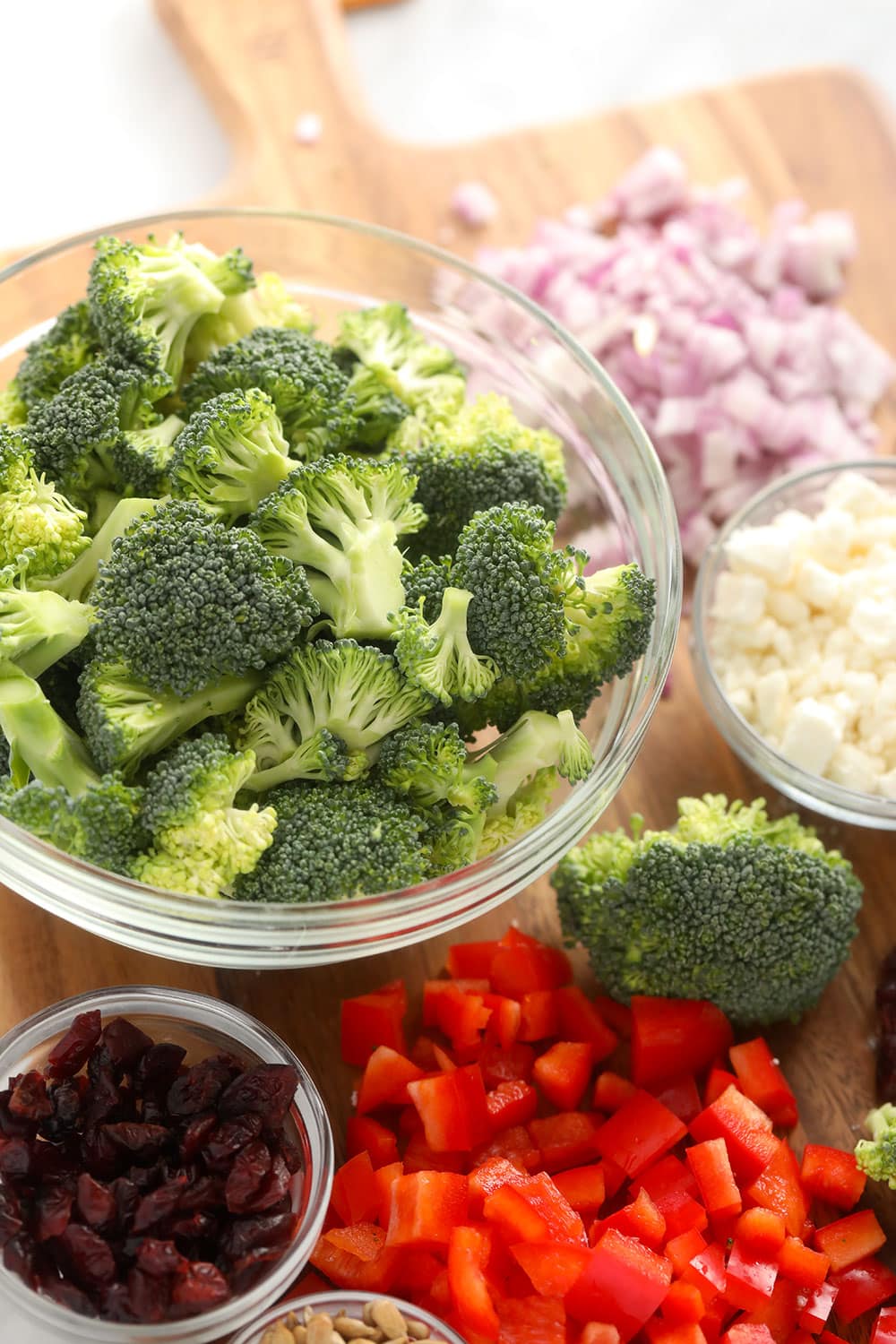 • Crumbled feta cheese- crumbed feta or crumbled goat cheese will work for this broccoli salad recipe! Or, omit the feta completely if you can’t tolerate dairy.
