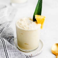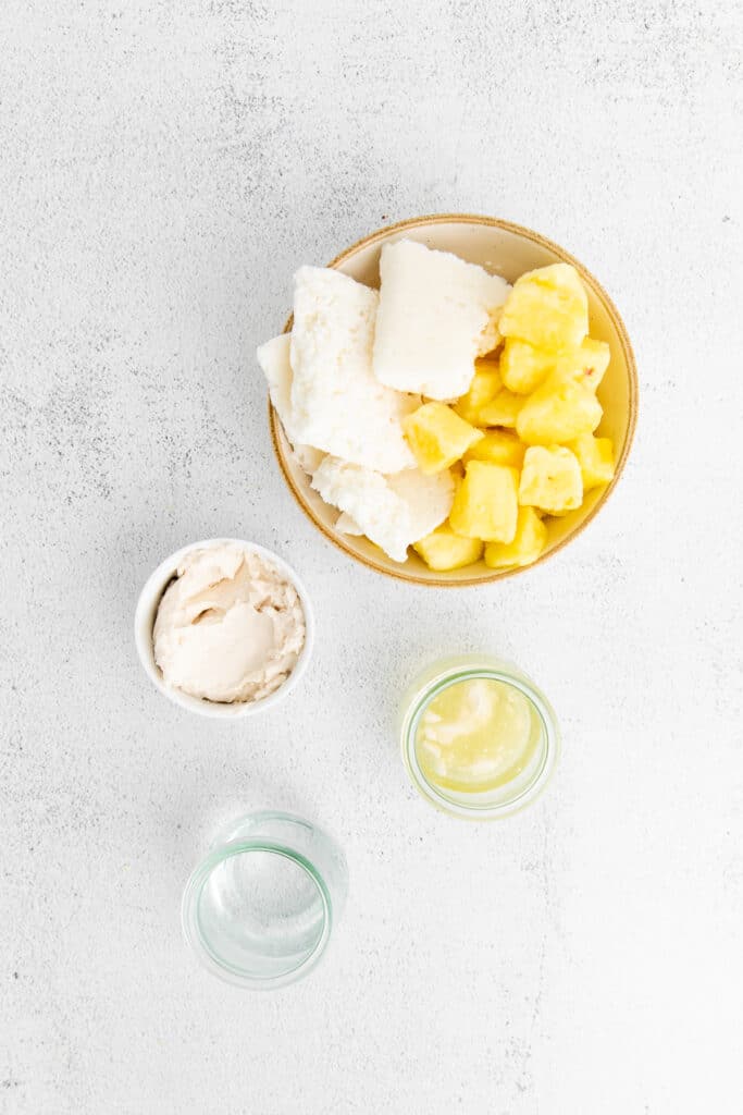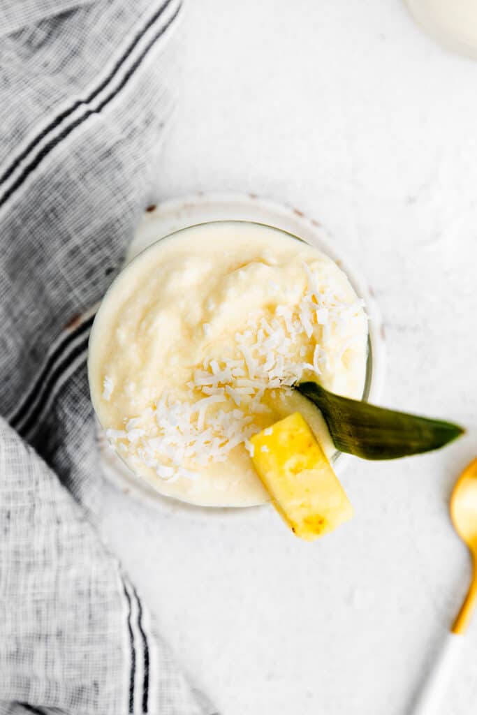 We wanted to use as whole of ingredients as possible in this piña colada recipe, which I why there is no juice or ice involved.