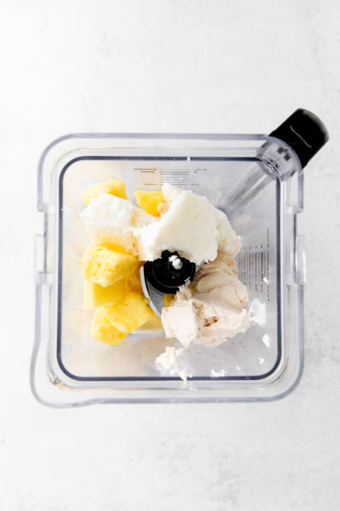 - Place frozen pineapple, frozen coconut, rum, coconut cream, and coconut water into a high-speed blender.