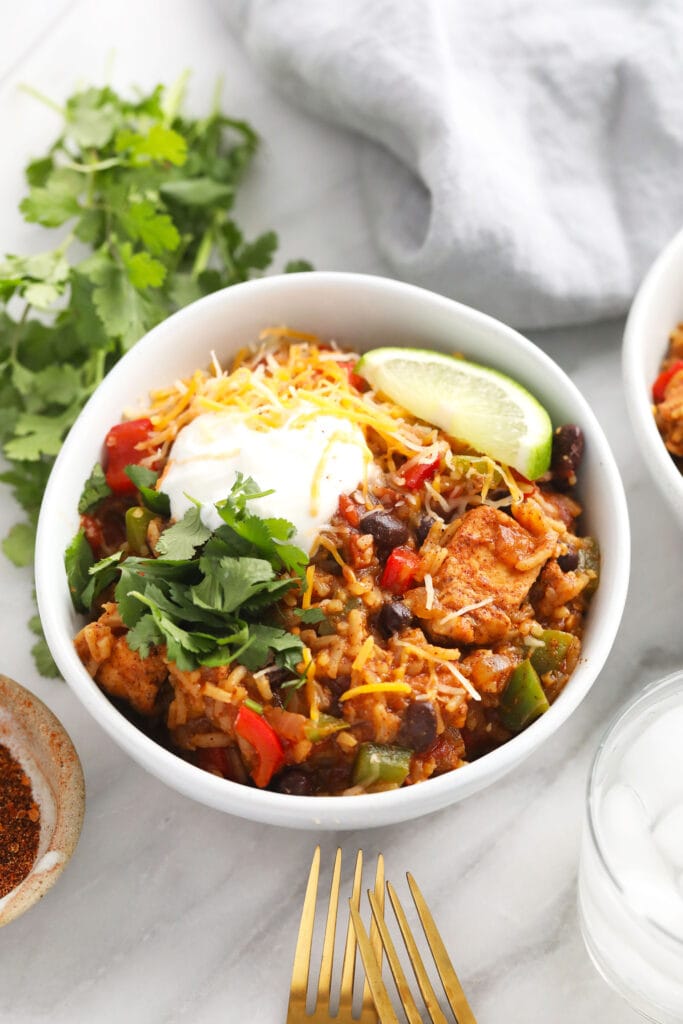 These Instant Pot Burrito Bowls with chicken are the perfect weeknight dinner! Protein and flavor-packed, and ready to enjoy in under 30 minutes.