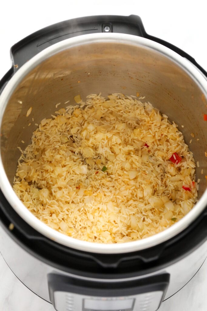 Now it’s time to pour the rice into the pot with the onion, and toast the rice for 2 minutes. You’ll love the flavor this gives the rice!