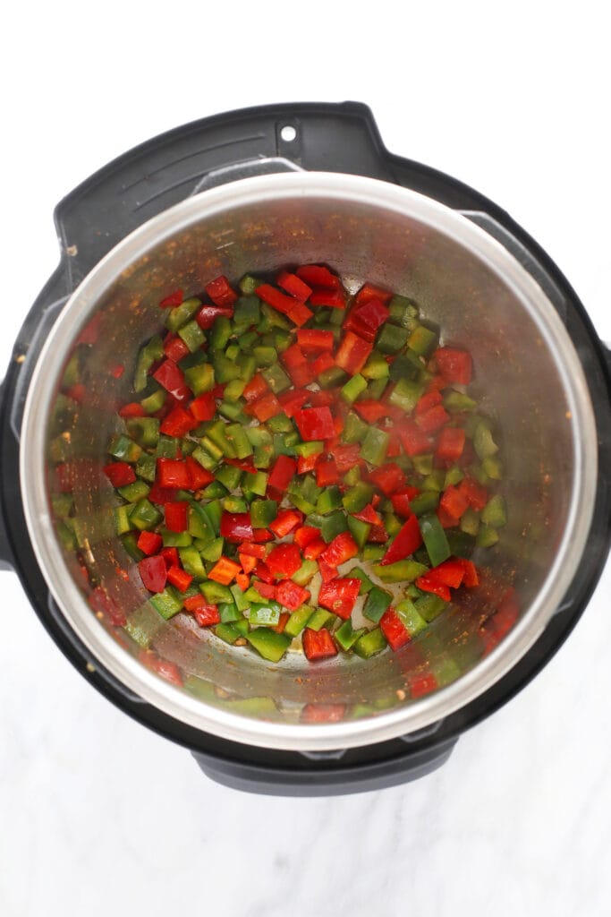 - Uncover the Instant Pot and add the bell peppers and black beans to the pot, stir, and place the cover back on the Instant Pot and let the peppers and black beans warm in the Instant Pot for 5 minutes.