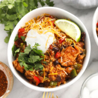 Can you freeze this recipe? Yes! Let the burrito bowls cool completely before placing inside a large freezer-safe bag or air-tight container with as much air removed as possible. Freeze for up to 3 months.