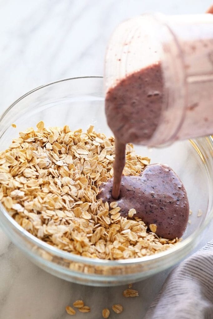 - Add rolled oats and baking powder to a large bowl and then add in the pureed blueberry mixture and mix well.