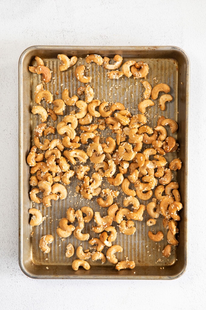 - Sprinkle on Sesame Seeds: Sprinkle on a generous amount of sesame seeds (and a pinch of salt!) and gently toss cashews one more time.