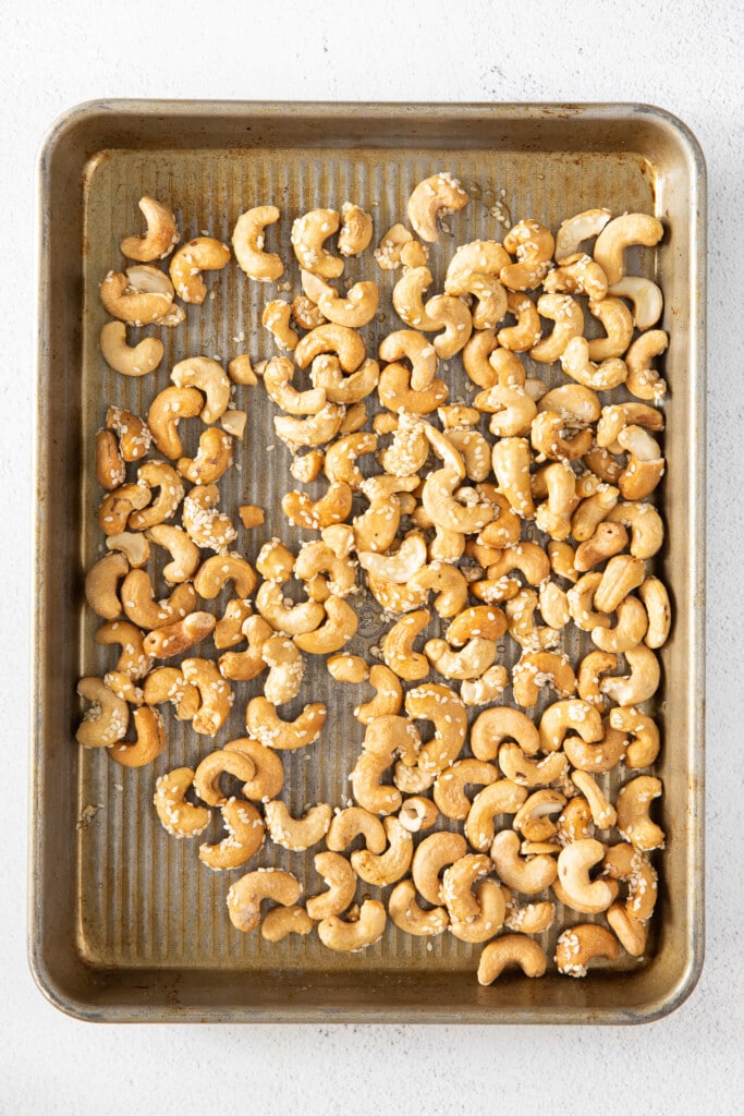 - Roast & Toss: Roast cashews at 375ºF for around 10 minutes tossing every 3 minutes so that the cashews don’t burn and cook evenly. After 10 minutes they should be nice and golden brown.