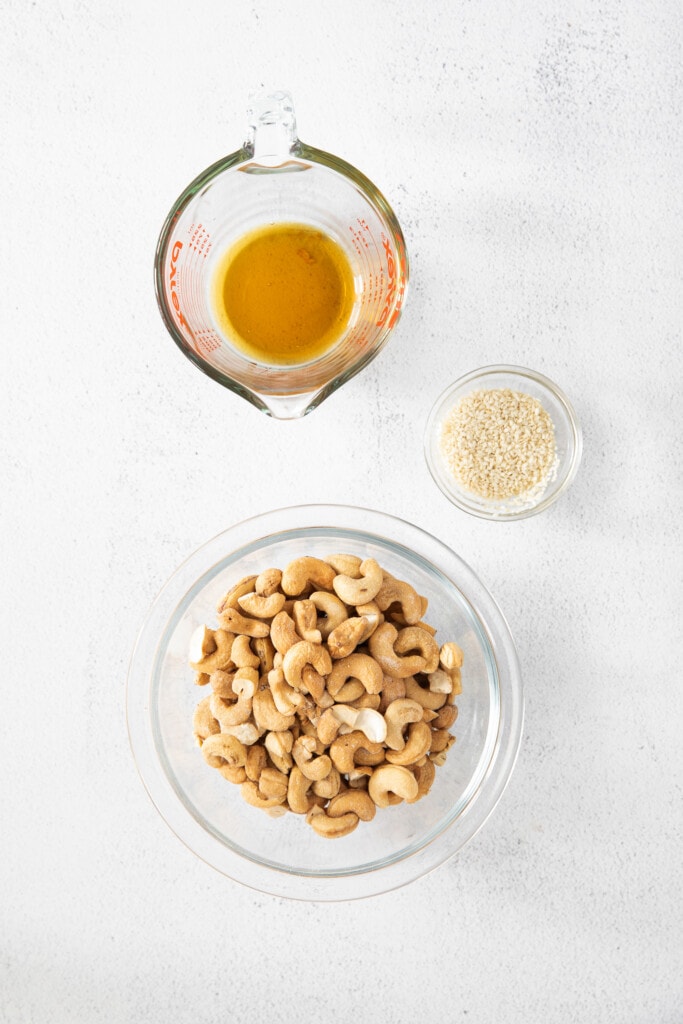 - Maple syrup: maple syrup is used to sweetened the nuts. It also helps the sesame seeds stick to the cashews.
