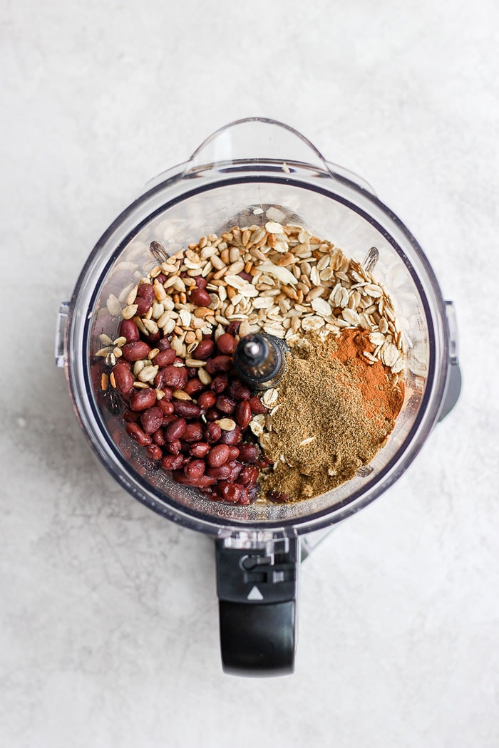 Place black beans, sunflower seeds, oats, and spices into a high-speed food processor and pulse until a thick paste is formed.