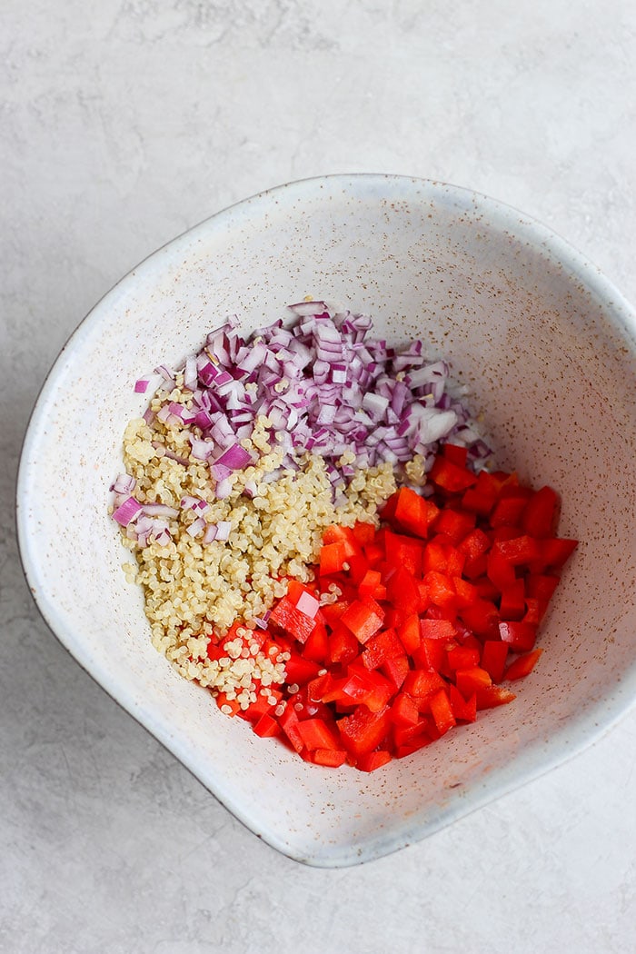 - In a separate bowl, combine black bean mixture, onion, quinoa, and red pepper. Mix well. It may help to use your hands!