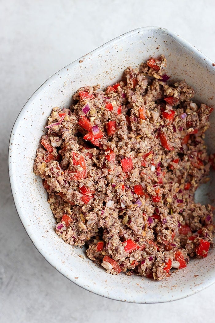 The “glute” or the binder for this recipe is a mixture of black beans, oats, seeds, and spices. The combination of all of them creates the perfect paste to hold the burger together.