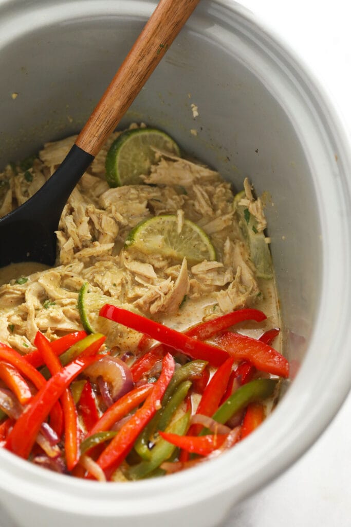 - Place the shredded chicken back into slow cooker with the sauce and mix. Add the cooked peppers and onions and fresh lime juice to the slow cooker and toss everything together.