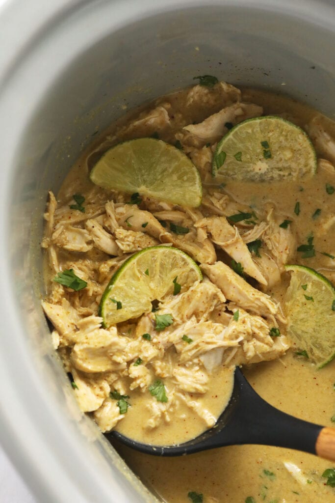 This recipe is made in the slow cooker because that’s what us Minnesota girls do with green curry paste and full-fat coconut milk. Literally, all you have to do is mix a delicious coconut curry sauce into the slow cooker, throw in your chicken, and then shred it for a delicious and easy meal!
