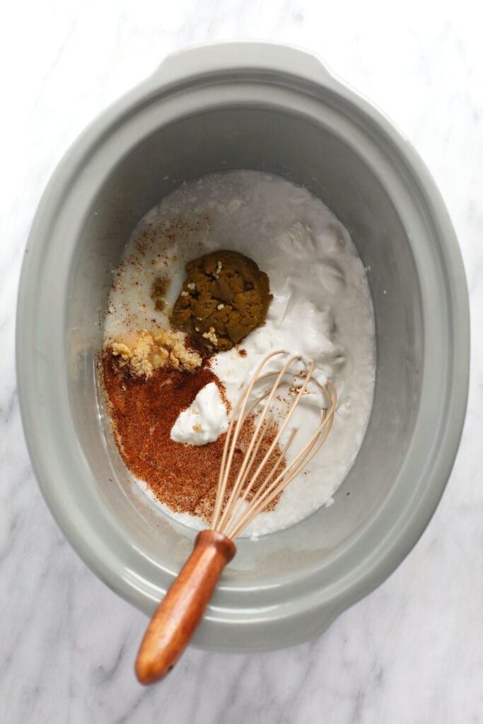 - Place the minced garlic, coconut milk, curry paste, garlic powder, salt, and chili powder into the slow cooker and whisk everything together until combined.
