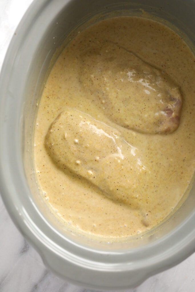 - Add the chicken: Once the sauce is combined add the chicken breasts to the slow cooker and make sure the chicken is submerged in the sauce.