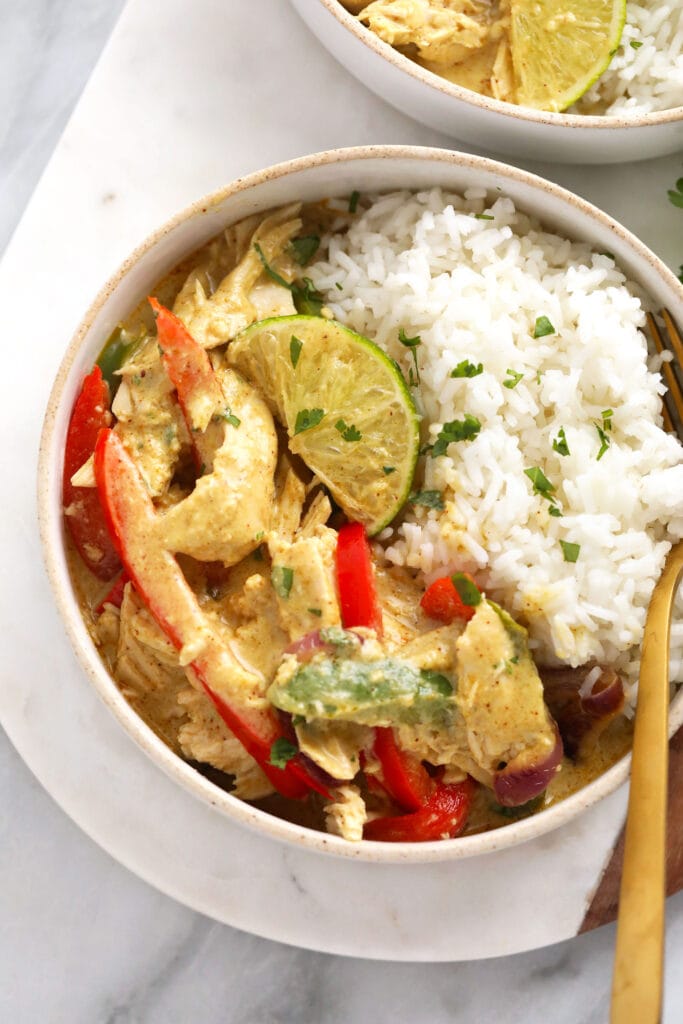 Prep your lunch or dinner for an entire week with our amazing crockpot curry chicken! This slow cooker coconut curry chicken is made with chicken breast, full-fat coconut milk, green curry paste, and a squeeze of lime.
