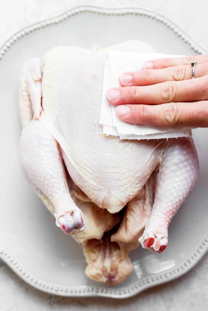 - Remove any innards inside of the chicken and pat the chicken dry with a paper towel.