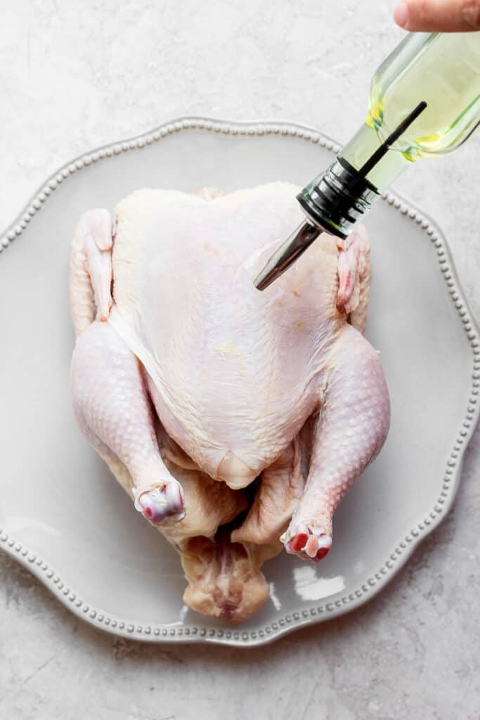 - Next drizzle olive oil all over the chicken. Rub the olive oil into the chicken, be sure to rub underneath the skin and every nook and cranny.